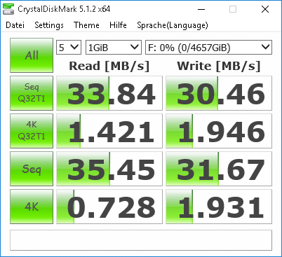 CrystalDiskMark 5.1.2 x64 liefert auf diesem Laptop Acer Aspire V3-112P-P5B3 am 2016-09-18 folgende Infos (am USB 3.0 Anschluss angeschlossen): (es war kein Antivirenscanner eingeschaltet, auch der von Windows 10 eingebaute Windows Defender war als Dienst deaktiviert.)