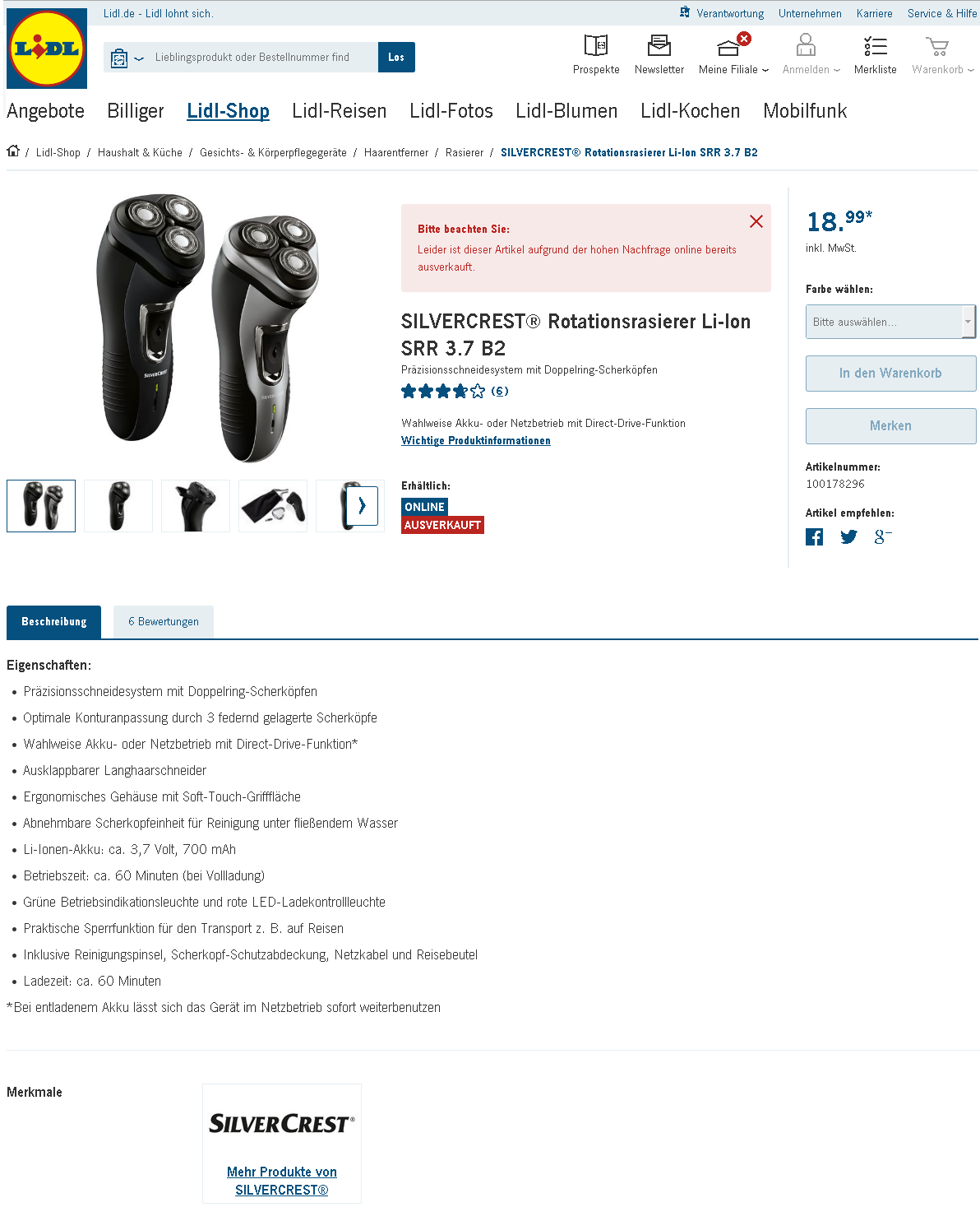 Das Gerät war im Lidl-Shop (online) für 18,99 € am 2016-08-26 bereits ausverkauft.